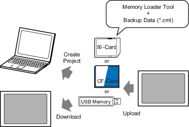 Backup (upload) the project in the display unit to external storage. The backup data (*.cml) can be converted into a project file (*.prx) and edited on a PC. You can also download and display the backup data on a different display unit.