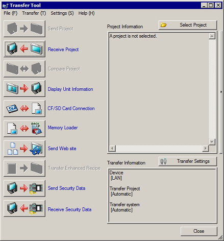 From the [Start] menu of your computer, click [All Programs]-[Pro-face]-[GP-Pro EX *.*] (*.* indicates the version)-[Transfer Tool] to start the Transfer Tool.