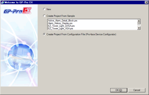 After the [Welcome to GP-Pro EX] dialog box appears, select [Create Project From Configuration File (Pro-face Device Configurator)], then click the [OK] button.