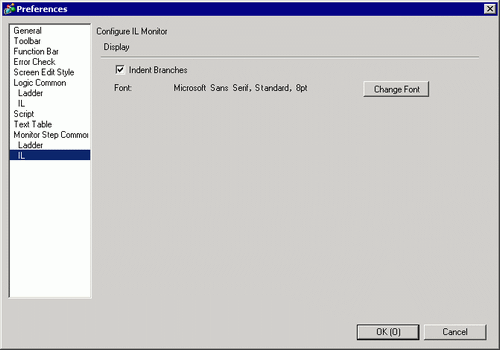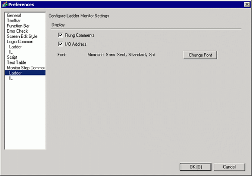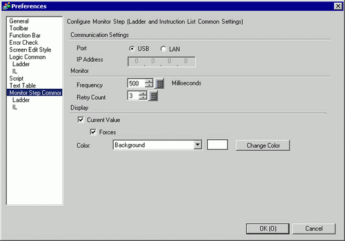 Select an item to change the color of from [Background], [Rung Comment], [Operand], [Current Value], [Forces], [I/O Address], [Instructions, Power Bar, Rungs], [Power Flow], [PID], [Ruled Line], [SOR], [Ladder Instructions], [Indent Branch], or [Label].