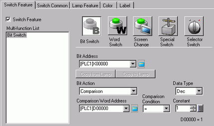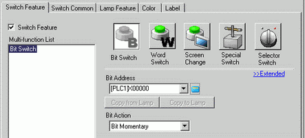 The [Switch Feature] tab's [Bit Address] setting is copied to the [Lamp Feature] tab's [Bit Address]. This is used when setting a Lamp Feature and Switch Feature to the same address.