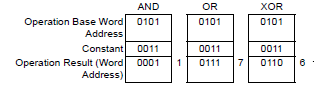 Performs a boolean logic operation (AND/OR/XOR) between the Word Address value and the constant specified. The result is written to the [Word Address].