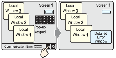 A Special Window has a higher priority display function than a Global or Local Window. Therefore if a File Manager (displayed as a Local Window) overlaps a Detailed Error Window while the Detailed Error Window is displayed, the File Manager will be hidden under the Detailed Error Window.