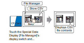 On the display unit, you can use a Special Data Display [CSV Display] or [File Manager] to view CSV data (such as recipe data, alarm history data, sampling data) stored on the external storage device. You can use this feature to check the data on the display unit.