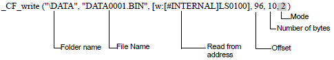 If the specified file (DATA0001.BIN in the example) already exists and the above statement is executed, 10 bytes of data stored in LS0100 and following areas are read and overwritten over the 10 bytes of data stored in the 17th and following bytes after the offset in the DATA0001.BIN file in the \DATA folder.