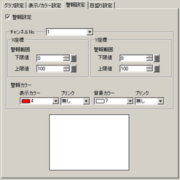 [グラフ設定]タブの[表示方法]で[表示範囲指定]を選択すると[警報設定]タブは表示されません。