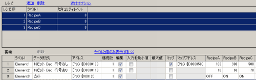 マップアドレス(D500)は、RecipeAの選択時にはElement1の値"100"が書き込まれ、RecipeBの選択時にはElement1の値"300"が書き込まれます。