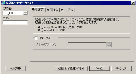拡張レシピデータの受信/エクスポートの処理状況や、編集時の処理結果を格納するアドレスを設定します。設定できるアドレスは内部デバイスのアドレスです。