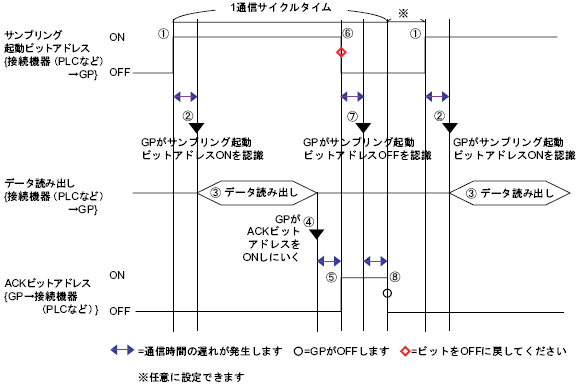 接続機器(PLCなど)が[ACKビットアドレス]がONしたことを検出したら、[サンプリング起動ビットアドレス]をOFFしてください。[サンプリング起動ビットアドレス]をOFFすると、[ACKビットアドレス]は自動的にOFFされます。