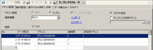 サンプリンググループの[アドレス設定]タブを開き、サンプリングしたいアドレスとデータ形式を指定して[クラウド送信]にチェックを入れます。