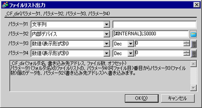 指定したフォルダに存在するファイルのリストを内部デバイスに書き込みます。パラメータ1で指定したフォルダのパラメータ4で指定したオフセット値から、パラメータ3で指定したファイル数分、パラメータ2で指定した内部デバイスへ書き込みます。オフセット「0」で1ファイル目(先頭ファイル)からとなります。
