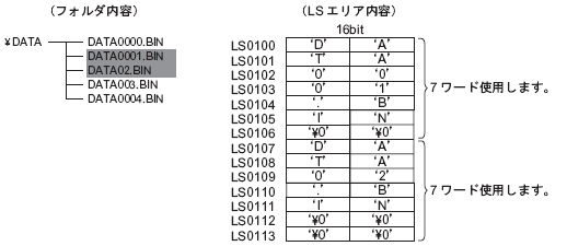 DATAフォルダ内に次のファイルが存在しているときに上記式を実行するとファイル名「DATA0001.BIN」、「DATA02.BIN」をLS0100以降に書き込みます。