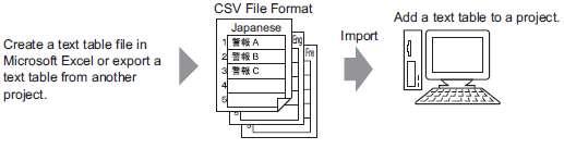 By creating the Text Table file (*.csv or *.txt) in Microsoft Excel in advance, you can use the file in the project by importing the file.