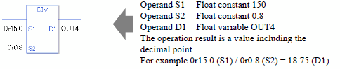 The DIV and DIVP instructions are division instructions. When a DIV instruction is executed, S1 will be divided by S2 and the result is stored in D1.