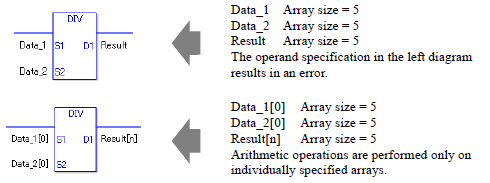 The DIV and DIVP instructions always pass power. When using the DIV and DIVP instructions, if the types of variables specified in operands S1, S2, and D1 are not the same, an error occurs. Designate the same variable type in all operands S1, S2, and D1.
