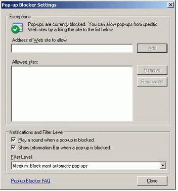 In Internet Explorer, from the [Tools] menu point to [Pop-up Blocker] and select [Pop-up Blocker Settings].