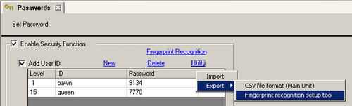 Save the Security Data settings in a folder of your choice. From [Utility], select [Export] - [Fingerprint recognition setup tool] and save the security file (*.bin)