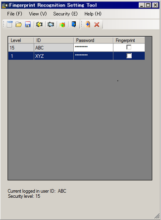 In the fingerprint recognition setup tool, you can register level, user ID, password and fingerprint data.