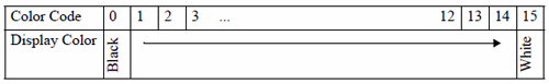 As shown below, display color code is stored in bits 0 to 3, and background color code is stored in bits 8 to 11. See the following for information about color codes.