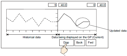 When using a Historical Trend Graph featuring the Display Historical Data function, the excluded dotted-line in the diagram is available for display on the screen. By touching the Display Historical Data Switch, past data stored in the display unit can be viewed on the graph.