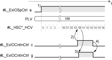 2) When the preload request bit (c) in the #L_ExIOCntInCtrl system variable turns ON, the preload value (100) is written to the current counter value (#L_HSC*HCV).