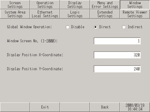 Select the action of the Global Window, available on all screens, from [Disable], [Direct], or [Indirect].