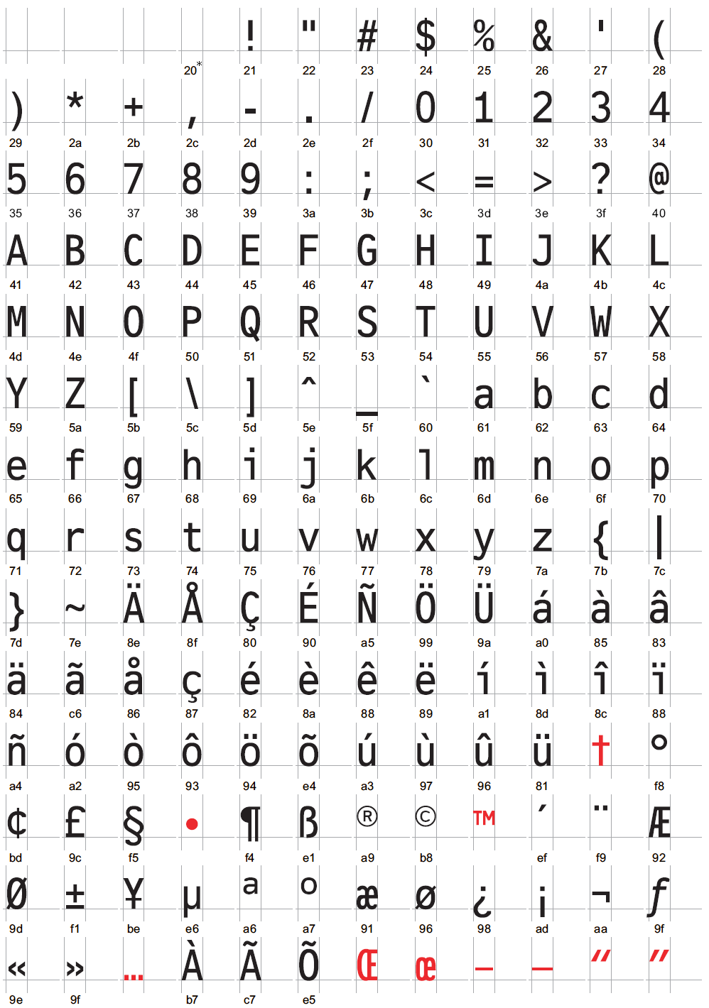 Only characters shown in black will be display in the following chart. Characters shown in red cannot be displayed at a Data Display [Text Display].