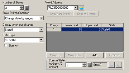 Set the ranges for changing states. When the value of the word address is between the [Lower Limit] and [Upper Limit] (Lower Limit <= Value of Word Address <= Upper Limit), the lamp is displayed with the specified [State].