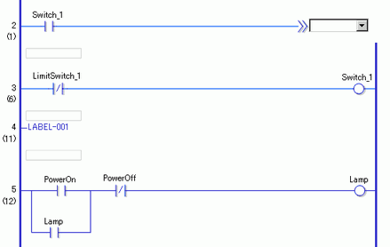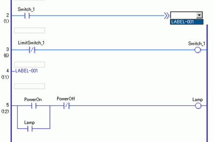 Here, for example, a [LABEL-001] label is inserted in the jump instruction, and the operation jumps to the 3rd rung upon execution of the JMP instruction when the "Switch 1" in the 2nd rung turns on.