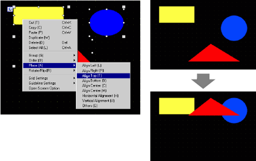 You can align the position of multiple objects. Select the objects that you want to align, right-click, point to [Align (A)] and then select the alignment operation, [Align Left (L)], [Align Middle (M)], [Align Right (R)], [Align Top (T)], [Align Center (C)], [Align Bottom (B)], [Horizontal Alignment (H)], [Vertical Alignment (V)], or [Others (E)]. In the following example, the rectangle, polygon, and circle are all aligned to the top.