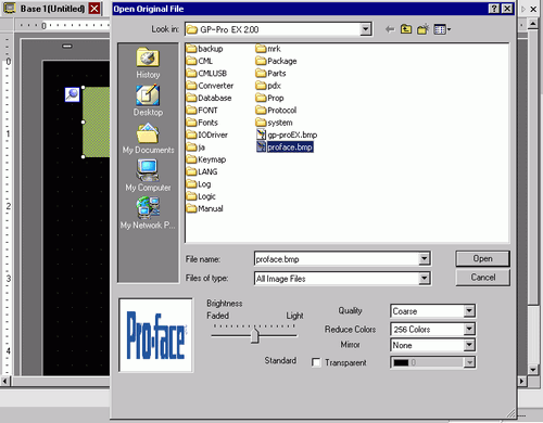 Click the screen drawing area to place the image part. Double-click the object to open its dialog box and define the [Files of type] and [File name] of the image to paste.