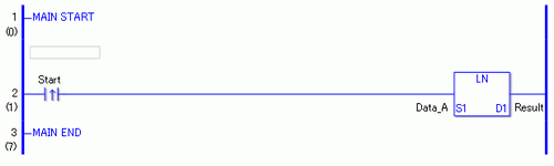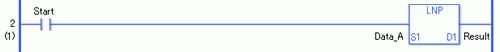The LN instruction is executed when the positive transition instruction turns ON. The LN instruction calculates the natural logarithmic function of Data_A and stores the result in D1.