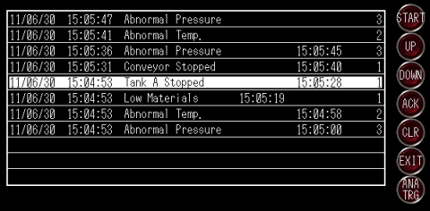 As the Alarm Analysis screen for operation log is configured by the system, you cannot change its font size, switch shapes, or labels.