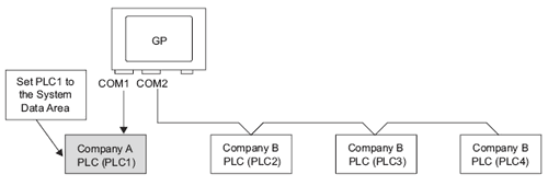 For example, In the following image, when four PLCs are connected to the display unit, only one of PLC1 to PLC4 can be set to the system data area.