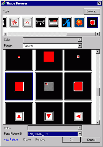 From the [View (V)] menu, point to [Work Space (W)] and then click [Parts Toolbox (T)]. In the Parts Toolbox, select the [Parts Palette] and [Type] to browse various parts and shapes.