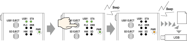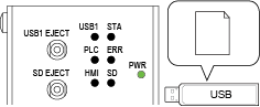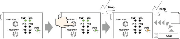 Release the touch, and within 30 seconds touch the [USB storage eject switch] and the buzzer will sound. After the buzzer, when you release the switch, the buzzer sounds again and upload from GP-4G01 to the Memory Loader begins. The power LED (PWR) flashes orange while uploading and the other LEDs remain off.
