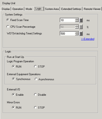 From the [Logic] tab, in the [Run at Startup] area, select either the [Run] or [Stop] options as the [Logic Program Operation].