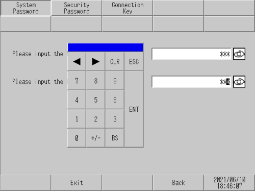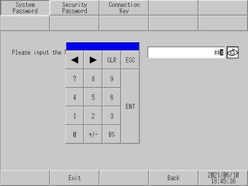 The [System Password] screen opens. Touch the input field and enter a password using the displayed numeric touch keys.