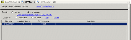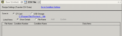From the [Common Settings (R)] menu, point to [Recipe (R)] and select [CSV Data Transmission (CSV File List) (F)]. In [Save In] select [CF Card] or [USB Storage].