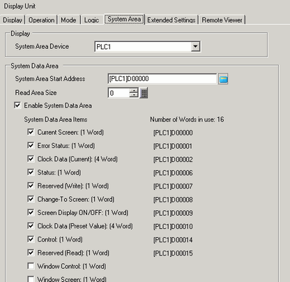 Select the [Enable System Data Area] check box and confirm that the [Change-To Screen Number: (1 Word)] check box is selected.