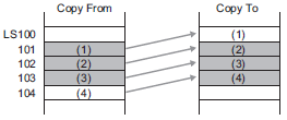 Copies device memory in one operation. The data of addresses specified with Parameter 3 are copied from the source word address specified with Parameter 2 to the destination word address specified with Parameter 1.
