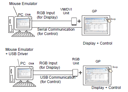 To output the display unit's touch coordinates through serial communication, install the Pro-face mouse emulation software on your PC, and operate the PC mouse cursor from the display unit.