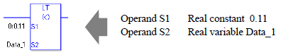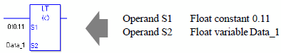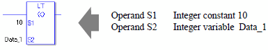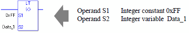 The LT instruction is a compare instruction. The LT instruction compares S1 with S2, and if the result is S1<S2, the instruction passes power. Be careful when comparing real values. For example, if the operand value is 1.99999999999, it is still less than 2. When using the LT instruction, an error will occur if the variables specified in operands S1 and S2 are not the same type. Designate the same variable type in all operands S1 and S2.