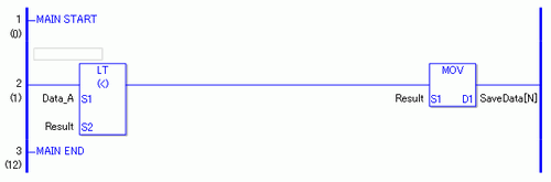 Data_A and the operation result are compared to determine whether Data_A is less than the operation result. If the result of the LT instruction is S1 < S2, the LT instruction passes power. Then the instruction to the right of the LT instruction is executed. In the above diagram, it's the MOV instruction.
