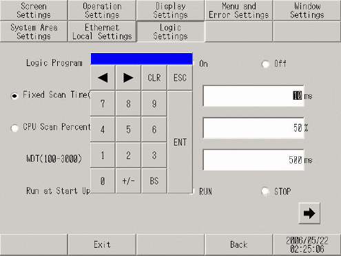 [Fixed Scan Time] field. Touch this area and use the numeric touch keys to enter the time for each scan of the logic program.