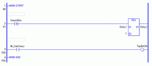 When a positive transition instruction turns ON, the RCL instruction is executed. When the RCL instruction is executed, the result from rotating 1 bit with carry over is stored in D1.