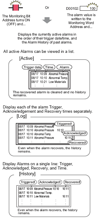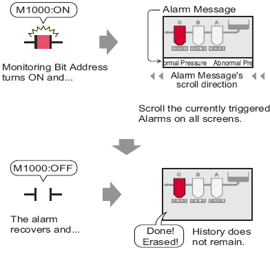 You can change the blocks displayed on each screen by registering different Alarm Messages with different blocks. On the same screen, you can also switch the Block Number to be displayed from the Device/PLC. |