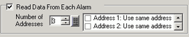 Select the [Read Data From Each Alarm] check box, and specify [Number of Addresses] (for example, 3) to read the data values.