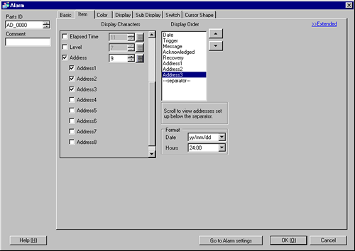 As needed, use the [Color] tab, and [Display] tab options to change alarm message's number of display characters, text color, background color, font, and size. Click [OK].