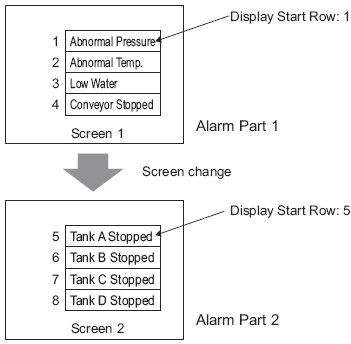 When multiple alarms are triggered, the extra rows that did not fit into a single Alarm part can be seen by setting a different display start row for several Alarm parts.